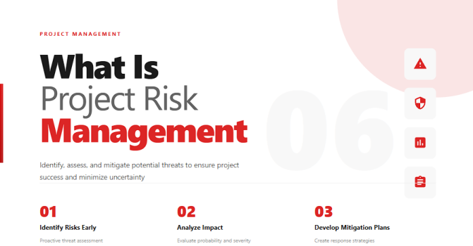 | 1. Risk Identification | Prevents surprises by listing potential threats early. | Brainstorm risks, review past projects, and interview stakeholders. |